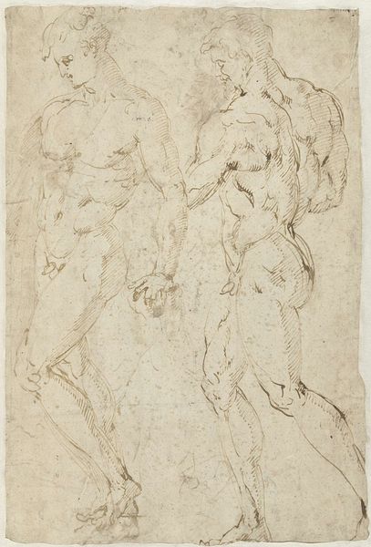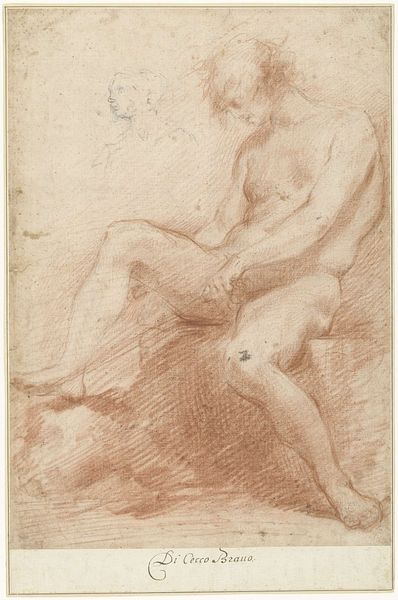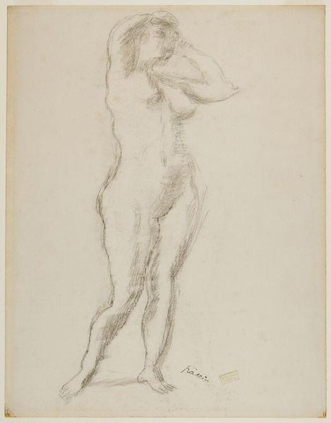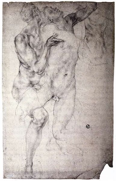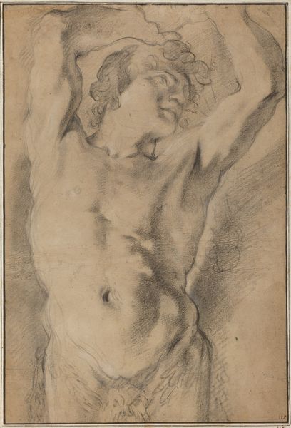 Curator: We’re looking at an intriguing work on paper titled "A Kneeling Youth Seen from Behind." Created by an anonymous artist sometime between 1550 and 1600, it’s currently held at the SMK, the National Gallery of Denmark. Editor: My immediate response is a sense of vulnerable strength. The charcoal rendering gives the figure a tactile, almost sculptural quality, despite being on a relatively flat plane. The back seems burdened but also resilient. Curator: Charcoal lends itself well to conveying the subtleties of form and musculature. Consider the materials available during that time, how workshops operated. The charcoal would have been manufactured through a specific process, then used by an artist deeply trained in anatomical studies, likely working under commission or for a patron with access to such material resources. Editor: Absolutely. And consider who would have been privy to nude studies like these. These drawings, of course, engage with the tradition of the male nude in Renaissance art, which, at times, upheld narrow ideals of beauty and power—reinforcing existing hierarchies in gender and class. Whose bodies were deemed worthy of artistic representation? Curator: The level of detail in the rendering speaks to its intended purpose—perhaps a study for a larger painting or sculpture. One wonders what pigments might have been used, the source and distribution of such materials. We must also consider the paper itself—the process of creating and sizing it would have affected the artist’s work. Editor: But is this anonymous body idealized, or does it capture some element of human frailty or tension? The drawing begs the questions: How does this figure relate to broader socio-political themes such as subjugation or liberation in the 16th century? Who was the intended viewer, and what power dynamic does this viewing imply? Curator: A compelling piece indeed. It encourages us to think about art making not as solitary act but as an intricate dance between the artist, their material conditions, and the labor required. Editor: I think you’re right. This charcoal drawing offers so many complex layers related to the historical, social, and aesthetic considerations that underline artistic creation.