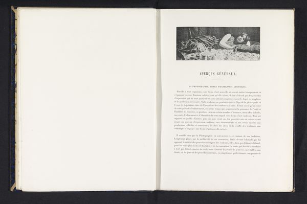 Editor: This is “Naaiende vrouw in een interieur,” or “Sewing woman in an interior,” by Constant Puyo, dated before 1896. It’s a photograph. It looks like a book, and there's something calming about the woman's posture and focus. What compositional elements stand out to you? Curator: Immediately, the stark contrast between the crisp photograph and the aging paper it's printed on grabs my attention. Note the photographer’s placement of the figure relative to the floral arrangement: the subject matter exists in concert and competition with its surroundings, demanding consideration for how they both occupy the picture plane. How does the juxtaposition of hard and soft lines direct your reading of the image? Editor: Well, the sharp lines of the furniture create a grid-like structure, contrasting with the soft, diffused focus on the woman and flowers. The photographer manipulates depth of field, calling attention to certain forms and textures, so the composition is dynamic. But what is Puyo trying to communicate through such varied treatment of these visual components? Curator: Communication, perhaps not so literal, but formal. By varying the sharpness, Puyo prioritizes how we *see* over what we *see*. We must engage with it formally before meaning can truly be drawn. Observe the textures of the fabrics. The arrangement isn't about the representation, but about light, shape, and form within the chosen medium. Consider how this challenges photography’s traditional claim to objective representation. Editor: So it’s not really about her sewing, but how our eye moves through the photograph. That’s fascinating. Thanks for showing me how to really *see* this work. Curator: It's about understanding that visual form precedes narrative content. That is the enduring lesson here.