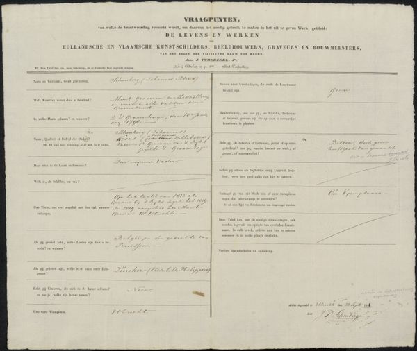Curator: This is an intriguing document. It’s a score card for dairy cows, dating back to January 19, 1904. Made by R.M. Washburn, instructor at the Baron de Hirsch Agricultural and Industrial School in Woodbine, New Jersey. Editor: Stark and utilitarian. The tight columns of text, the regimented rows—it all feels very…clinical. Almost sterile. What impact did such methods have? Curator: The school itself was established to aid Jewish immigrants in agricultural pursuits. This card represents an effort to apply scientific principles to animal husbandry. The labor involved in producing such a meticulous document highlights the school's commitment to rigorous training and standardization. Editor: Yes, the materiality speaks volumes. It’s not just about the content, but the labor and social context embedded within. The scale of points, the handwritten annotations—a fascinating intersection of handcraft and emerging industrial practices. I can't help wonder what 'Queen' thought of it all. Curator: It shows us the very beginnings of modern agriculture and also, in its way, demonstrates the role of art and design as tools for social and economic progress. Editor: Precisely. It's a snapshot of a community striving to adapt and thrive, as well as an image of the scientific methods taking shape within society.