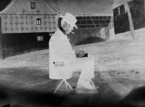 Curator: This photograph, taken by Julia Feininger, captures Lyonel Feininger on Rügen beach. The print is modest in size. Editor: It’s quite striking. The inverted tones give it an otherworldly feel, like a memory or a dream. The figure, presumably Lyonel, has this almost ethereal quality. Curator: The inverted tones definitely add a layer of complexity, a reversal that plays with our perception. There's something haunting, almost ghostlike, about it. Editor: Precisely. And the hat, the coat… the figure looks like a wanderer, a flaneur stepping out of time. It reminds me of how artists often see themselves—traveling, observing, slightly apart. Curator: The boats in the background hint at journeys, both literal and metaphorical. Perhaps reflecting Feininger’s own artistic voyages. Editor: It seems to encapsulate that Romantic idea of the solitary figure against the vastness of nature. A small memento, rich with feeling.
