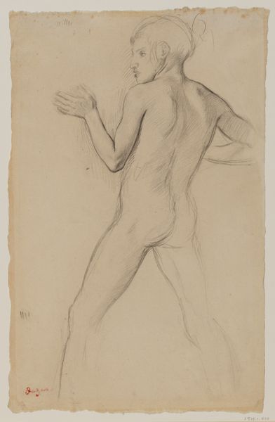 Jacques François Joseph Saly created this artwork, titled "Kvindelig modelfigur med hænderne foran brystet", as a drawing with dimensions of 278 mm in height and 147 mm in width. Here, a female figure stands, hands clasped modestly before her chest. It is a pose that echoes through art history, evoking the Venus Pudica. This gesture first appeared in classical antiquity as a symbol of humility, concealing nudity while drawing attention to it. Consider Botticelli's Venus – she shares this pose, yet her story diverges. Botticelli’s Venus carries classical ideals of beauty, while here Saly focuses on the model, raw and exposed. It is an intense moment where we see the symbol of modesty evolve, shaped by the artist’s gaze. The gesture has resurfaced, shifting in meaning yet forever bound by the thread of cultural memory, offering new interpretations across time.