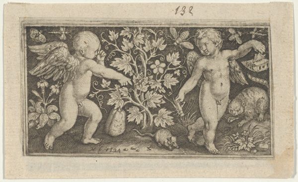 This engraving by Pietro Antonio Cotta features two putti reaching for roses in a potted shrub. The rose, a profound symbol in Western art, extends far beyond mere botanical beauty; it encapsulates themes of love, transience, and spiritual purity. We observe this symbolism echoed through the ages, from ancient Roman festivals honoring Venus, where roses were symbols of love and beauty, to their prominence in Christian iconography, representing the Virgin Mary as the ‘mystical rose.’ Even in Botticelli's “Primavera”, roses are strewn about, signifying fertility and renewal. The putti themselves, these chubby cherubs, are descendants of classical Cupids, embodying a playful, mischievous spirit. Their presence here suggests an innocent interaction with the themes the roses represent. The act of reaching, almost grasping, can be interpreted as a desire to capture or understand these complex emotions. The cyclical nature of the rose, from bloom to wither, acts as a reminder of life’s fleeting moments, a poignant message that continues to resonate through art history.