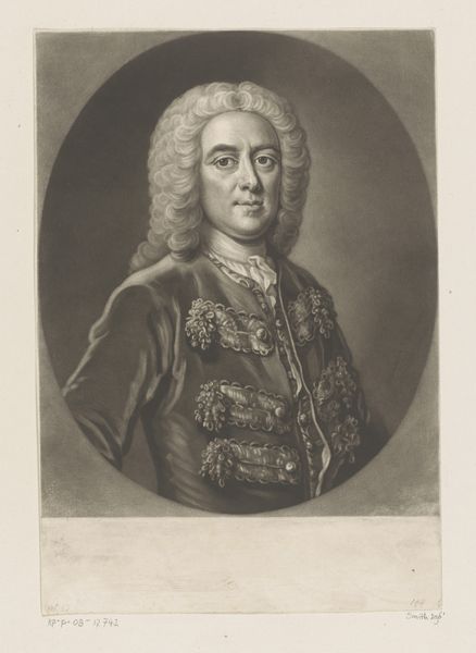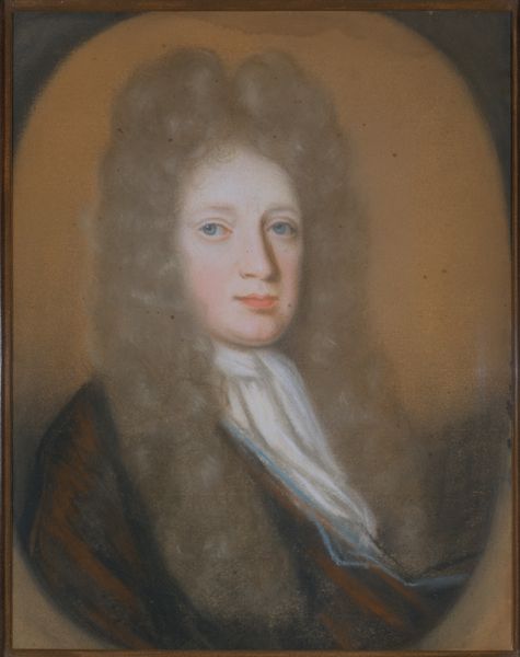 Curator: Here we have Rosalba Carriera's "Sir John Reade, Baronet," a pastel portrait created around 1739. Editor: My first impression is one of restrained elegance. There's a certain softness to the rendering that evokes a gentle, almost melancholic mood. Curator: The handling of pastel is quite masterful, wouldn’t you agree? Note how Carriera uses delicate strokes to capture the subtle gradations of light on his face. The texture adds depth to an otherwise smooth surface. Editor: Absolutely. And I'm struck by how Carriera navigates issues of gender and class through costume. Sir John Reade's expensive vest, soft wig, and reddish-brown coat symbolize his social status, yet the sensitive, almost feminine lines, suggest a challenge to conventional ideas of masculine portraiture. He's an attractive man but the overall impact feels carefully gendered. Curator: Indeed. Carriera manipulates pictorial space by employing asymmetry with this pastel application, with darker and harder-drawn sections framing the ethereal light of the subject's face, all which enhance a visual and psychic experience that one would argue is beyond typical. The balance here relies almost solely on color and value rather than spatial representation. Editor: It’s hard not to read his expression, too, as somehow…resigned. He existed during a time of extreme inequities based on class and race, and one wonders if we’re seeing a subtle commentary, even in this commissioned portrait. Curator: Perhaps. However, considering the broader rococo, we can clearly see a shift of painterly values with Carriera where beauty is paramount. His state is a visual experience above else, no? A pure sensual engagement. Editor: I’m not arguing with the aesthetic considerations, but when discussing portraiture of privileged figures in a bygone era, the context is just too rich to ignore, the subtexts, too telling. Curator: Well, however you find yourself engaging with the image, I trust our listeners appreciate how you too might navigate the waters between sheer beauty and embedded socio-historical meaning that this artist presents to us. Editor: Precisely. What stories do we choose to tell, and what goes unsaid? Carriera's Sir John is in himself a compelling historical lens.