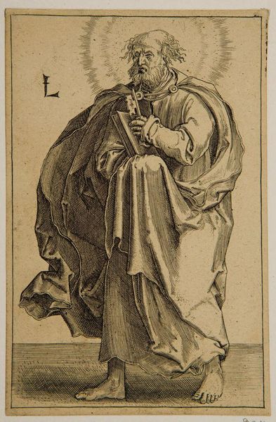 Curator: This captivating print, titled "Jeremiah," is an anonymous work currently housed in the Harvard Art Museums. The linear quality makes me think of the engraving tools and processes that must have been involved in its creation. Editor: There's a distinct weight of sorrow conveyed here. Looking at Jeremiah's face, the set of his jaw, one senses the burden of prophecy and the social implications of his message. Curator: Agreed. Notice the meticulous detail in his garments, which might signal his status, but also reflect the time and labor that went into producing such complex patterns and forms in print. Editor: Indeed, the opulence of his garb contrasts sharply with the urgency and dire nature of his prophetic role. It speaks volumes about power structures, who gets to speak, and the context of that speech. Curator: I find myself considering the cultural context of printmaking at the time. It served as a method of disseminating imagery and ideas, impacting the availability and consumption of information across various social strata. Editor: Absolutely. This image, reproduced and distributed, could either reinforce or challenge existing power dynamics. Art like this invites a deeper conversation about identity, class, and the responsibility of the artist, even when anonymous. Curator: This examination has definitely enriched my appreciation for this somewhat unassuming piece. Editor: It's in these nuanced material and historical readings that artworks truly come alive, I think.