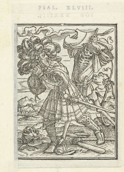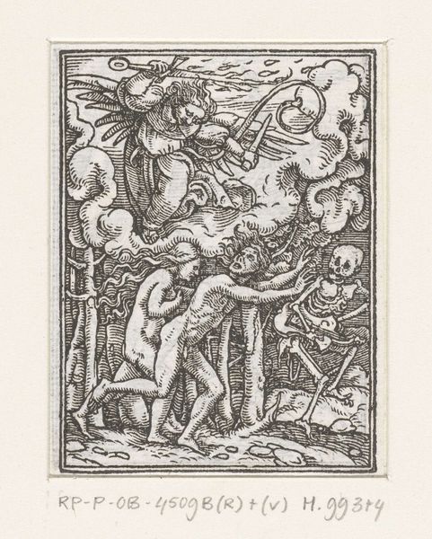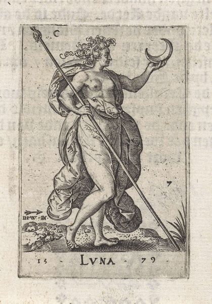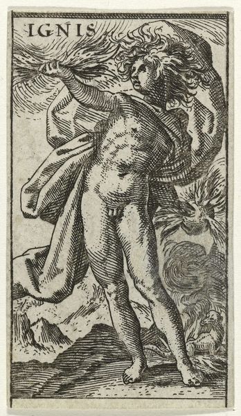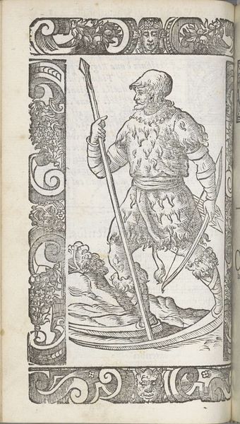 Editor: So, this engraving, "Donna di Biarmia," made around 1598 by Christoph Krieger, really caught my eye. It feels like a scene ripped from a history book, but there's a certain starkness in its lines. What do you make of its overall composition? Curator: The first thing that strikes me is the line work. Observe the artist's strategic use of hatching and cross-hatching to create tonal variations, almost mimicking the textures of fur and fabric. Notice how this technique not only defines form, creating three dimensionality from essentially two, but contributes to the overall dynamic composition as well. Editor: I do see that now. The lines almost give it movement, especially in the woman's clothing. What about the borders with the cherubs and grotesques, do they add something or distract? Curator: They do not distract but complement and frame the figure, leading the viewer's eye strategically within the image. One must look closely to understand the interplay between the various elements to come to a conclusion, otherwise it remains merely a decorative border. It directs our focus towards the central subject—her gaze, the taut bow—and the underlying geometry of the artwork as a whole. It all works to enhance her figure's powerful stance. Does the line quality change how you experience the work now? Editor: Yes, definitely! I initially saw just a historical figure, but looking at the lines themselves, their direction and density, creates a much more compelling story of skill and form. Curator: Precisely. That is how careful examination can reshape understanding. Editor: I’ll definitely pay closer attention to line quality moving forward.