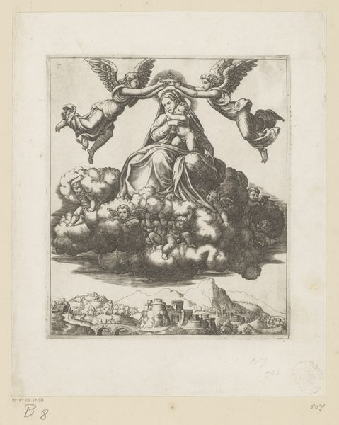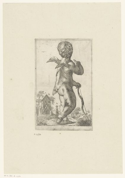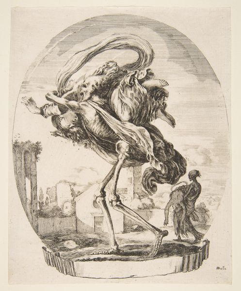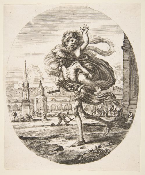 This etching, La Mort Emportant un Enfant, was created by Stefano della Bella sometime in the mid-17th century. It's a print, made by incising lines into a copper plate, inking it, and running it through a press. Prints like this were relatively inexpensive, and therefore accessible to a wide audience. The technique allowed for the easy reproduction of images, which could then be circulated and consumed as commodities. The image shows a skeleton carrying a child on his shoulders and this reflects the very high rates of childhood mortality at this time. Della Bella has skillfully used line to create a sense of depth and shadow. Ultimately, this print's significance lies not only in its artistic qualities but also in its function as a cultural artifact, reflecting the social and economic conditions of its time. It reminds us of the importance of considering the materials, making, and context in understanding the full meaning of an artwork.