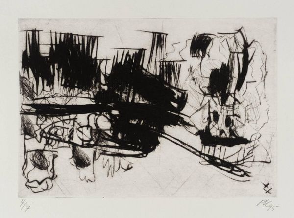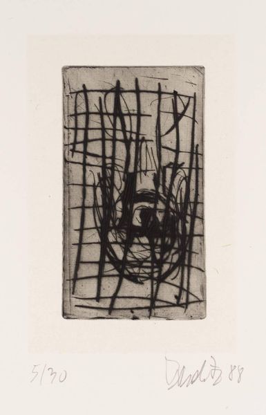 Editor: This striking print by Per Kirkeby, from the Tate collection, depicts a figure in motion. It feels quite primal and urgent. What symbols do you see at play here? Curator: The figure’s hurried form, rendered in stark black against the gridded background, suggests a flight from confinement, or perhaps a pursuit. Consider the cage-like structure. Does it evoke a sense of protection or imprisonment? Editor: Imprisonment, definitely. It looks desperate. Curator: And what of the seemingly random marks at the bottom? They resemble footprints, or perhaps more abstractly, the vestiges of a struggle, invoking a timeless narrative of human striving against limitations. It’s a powerful image. Editor: I see that now. It's a story etched in symbols of freedom and restraint. Curator: Indeed. Kirkeby uses imagery to tap into our shared, often subconscious understanding of these concepts.