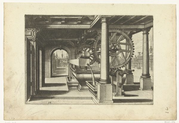 Curator: This intricate engraving, dating back to around 1574, is titled "Waterput onder colonnade," or "Well under Colonnade." It comes to us from the hand, or rather the burin, of Johannes or Lucas van Doetechum. It's currently held here at the Rijksmuseum. Editor: My first thought is "architectural fever dream." It has this uncanny Escher-like quality, a sort of practical absurdity. All that implied labor just to move water. Curator: That sense of calculated artifice is absolutely key. Northern Renaissance artists were deeply interested in perspective, and you see that interest manifest here, in how the space recedes. The print becomes an exploration, a demonstration even, of constructed depth. It shows almost impossible building elements to play tricks on the eye. Editor: Yes, there's this tension between the utilitarian—a well—and the purely aesthetic, all those classical columns and impossible gears. It feels almost theatrical, like a stage set, this image about power—power over nature and the power of artistic creation. Curator: The engraving medium itself lends to this. The crisp lines, the sharp contrasts…everything is so deliberately placed. Remember that prints like these weren't just art objects; they circulated knowledge. Architectural ideas, engineering principles…all disseminated through these affordable images. The building is shown within city context for some strange and wonderful reason, what might this say to you? Editor: I see that—I think it gives insight. Look past all the decorative elements of this colonnade and see a practical, though perhaps inefficient, construction designed for human survival in that city over yonder in the horizon line of the archway. Also this sort of art being “affordable” is perhaps, also inaccurate, remember how only upper-class citizens owned paintings because they were commissioned, this sort of architectural engraving, perhaps gave them access. Curator: It gives me great pause to consider the power, ingenuity and sheer beauty this print holds. What about you? Editor: Definitely makes you wonder what mundane things in today’s day will seem utterly arcane and intriguing to others.