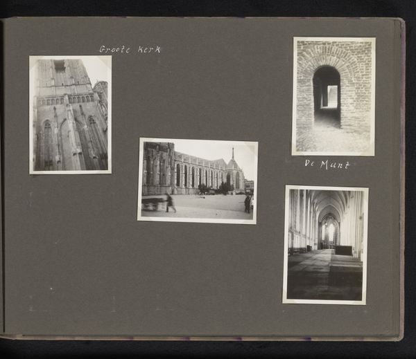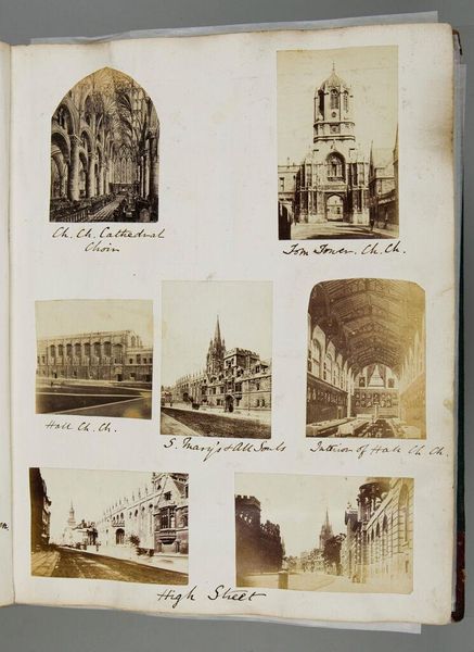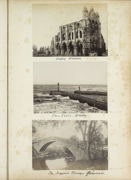 Curator: This is an untitled album page by Iorwerth Grey Lloyd, featuring six photographic views of Ludlow, England. Editor: The sepia tones and aged paper give it a very nostalgic feel. I'm immediately drawn to the textures; you can almost feel the stone of those castle ruins. Curator: Right, the composition itself speaks to the rise of photographic reproduction and documentation, making places like Ludlow accessible to a wider audience. Editor: And I wonder about the labor involved in producing these prints, arranging them so meticulously on the page. The material conditions of photographic printing must have been significant. Curator: It's also interesting how the album functions as a proto-Instagram, a curated presentation of a place and experience for a specific viewer. Editor: True, thinking about the cultural value placed on these images, it seems this album aimed to capture a specific idea of British heritage and identity. Curator: Absolutely, and that visual language is deeply embedded within the socio-political context of the time. It truly reveals how the public engaged with art. Editor: Seeing it this way enriches my experience with the artwork.