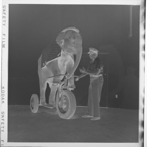 Curator: This intriguing photograph from Jack Gould is called *Untitled (monkey sitting next to tricycle)*. The image, a modest 5.7 x 5.7 cm, currently resides at the Harvard Art Museums. Editor: It's haunting, isn't it? Like a faded memory or a dream you can't quite grasp. The monkey's gaze is so pensive. Curator: Indeed. The work's power lies in its unsettling juxtaposition of innocence and captivity. The tricycle becomes a symbol of thwarted freedom, a poignant commentary on animal exploitation and agency. Editor: I see it too. It's sad and funny at the same time, like a Beckett play. Maybe the monkey is waiting for Godot on that trike, forever stuck in a loop. Curator: Perhaps Gould sought to critique societal structures, revealing the absurdity and cruelty embedded within our interactions with the animal kingdom. Editor: You always bring it back to the social stuff, don't you? Still, it makes you think. I guess it's a ride we're all on, in a way. Curator: Precisely. It prompts us to consider our roles and responsibilities within the broader context of power dynamics. Editor: Right. I’m going to go home and hug my cat.