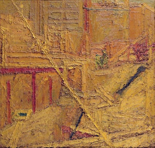 Istvan Ilosvai Varga made this painting titled "Pink Image" with oil on canvas. What strikes me is the all-overness of the color. It’s like he mixed up a big old vat of pinkish-red and then just went at it. You know, there’s no real hiding here. The process is right there on the surface. Look closely, you can see the texture of the canvas coming through, like the paint has been pushed around, scraped, and layered, almost fighting to find its place. See that thick line zig-zagging across the middle ground? It is almost like a structural beam holding the picture together but at the same time it threatens to break the surface apart. I’m thinking of artists like Guston and de Kooning who used abstraction to get at something raw and real. The painting is like a conversation, full of starts and stops, questions and answers.