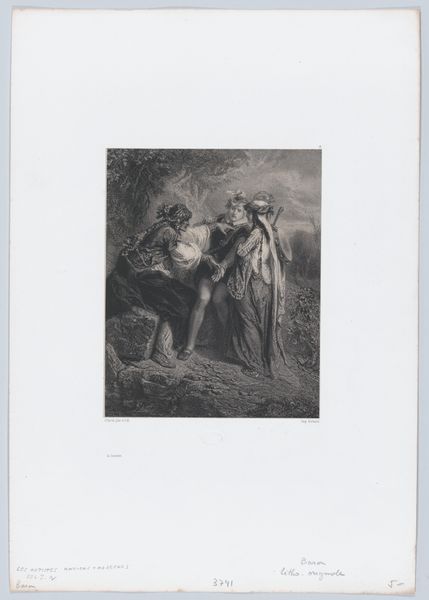Curator: This intriguing print, created sometime between 1851 and 1865, is titled "Amor Surrounded by Four People" and comes to us from the hand of Célestin Nanteuil. What leaps out at you initially? Editor: A sort of sepia-toned dream. There's a distinct lightness to the work, but almost a somber, reflective quality, heightened by the aged paper perhaps? Cupid's certainly causing chaos amid the classical figures! Curator: Exactly! Nanteuil's Romantic sensibilities shine here. We have Cupid, the god of love, of course, poised with his arrow. What I see is a confluence of Romanticism's embrace of emotion and its fascination with historical and allegorical subjects. Editor: I love how it merges a somewhat history-painting style with those soft, light pencil strokes and figuration, as it's listed. There is such an intimate feeling created by such a classical topic... Cupid's usually about the fanfare, the seduction, the boldness, but here it looks so demure, if impish! Curator: The piece itself can be read through the lens of nineteenth-century societal expectations and anxieties around love, marriage, and social roles, so to me, his somewhat docile character may reflect that social constriction. In choosing printmaking, it democratized its message and imagery too. Editor: Do you think its history impacts our reading of the subjects today? Does it become simply 'an artwork of its time' instead of a relatable depiction? Because I actually love its open and more relaxed approach, and can't shake that quiet initial somberness I noticed... Curator: The history imbues the figures and story, surely! As historians and artists, aren't we trying to relate them together even when we face conflict, trying to discover a place of common appreciation? I see that in its approach of its own period of anxiety toward modern ideas. Editor: True, very well observed, like finding hidden chambers that are there but have been forgotten, for many years perhaps... Thank you!