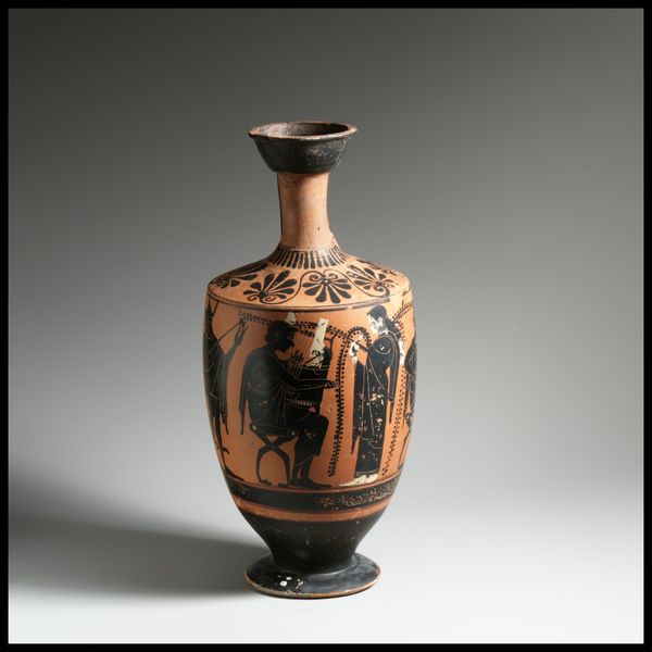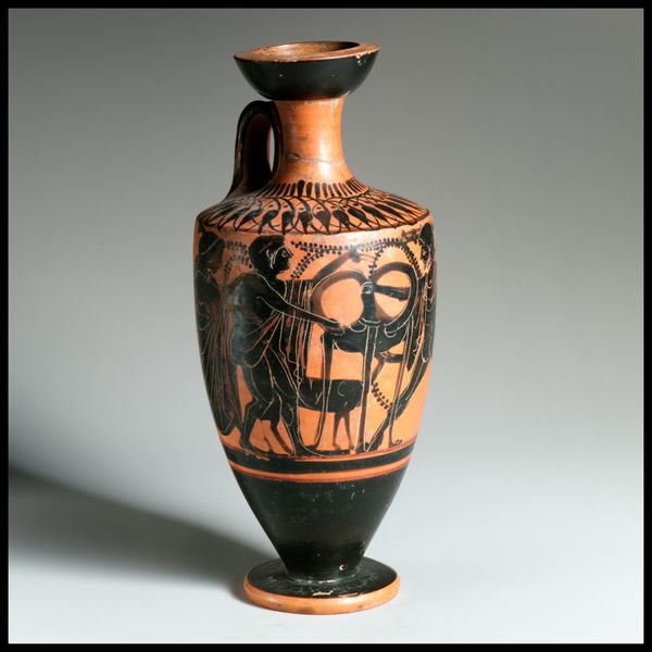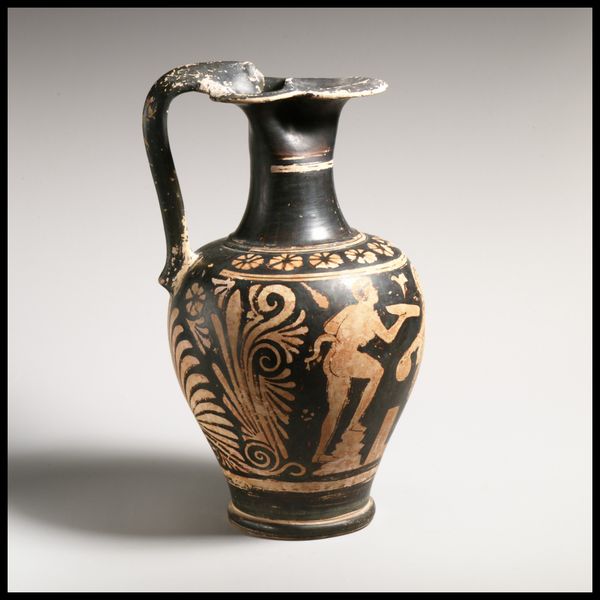 Curator: Here we have a terracotta oinochoe, a chous or jug, created around 350 BC by the Heavy Chin Group. It is currently held in the collection of the Metropolitan Museum of Art. Editor: It’s a striking piece. The dark slip, contrasted against the pale stylized figures, creates a mood that's both elegant and grounded. It feels simultaneously delicate and incredibly durable, doesn’t it? Curator: Precisely. Look at the labor involved in crafting this object; the extraction of the clay, the precise turning on the wheel, and the sophisticated firing techniques all speak to the highly specialized and hierarchical labor systems prevalent at the time. This wasn't just functional, but also a display of skill. Editor: Absolutely, and a display inextricably linked to power and social structure. The chous itself was typically associated with the Anthesteria festival, a festival of Dionysus and a period during which social norms were inverted and re-evaluated. The jugs held a ritual significance. Curator: Exactly. Think of the pigments themselves: likely derived from minerals, carefully ground and applied by hand, telling us something about trade routes and the value placed on artistic production. Editor: It's important to remember these jugs weren’t just for the elite. While some were undoubtedly luxury goods, many were also used by ordinary Athenians. It poses critical questions about identity formation: How did the availability of decorated pottery shape social cohesion or divisions? What narratives about themselves were ordinary Athenians able to actively participate in via use of ceramics in the marketplace, domestic life, and ritual? Curator: The production sites, too, provide fertile ground for exploring these narratives. Where was the clay sourced? What were the working conditions like? Were there enslaved artisans involved in the making? All points of intersection related to labor practices. Editor: Seeing these ancient objects helps to confront issues around colonialism as well; who decided it was of better use as a display item in New York rather than being left in its original geographical, and therefore, social and historic context? It raises significant questions concerning agency and ownership. Curator: Indeed. Focusing on process unveils that cultural context that complicates assumptions around aesthetic experience. Editor: Precisely. Viewing the piece now, I see not just a beautiful jug, but the layered, intersectional, messy reality of its existence— and continued life, continents and millennia away from its makers.