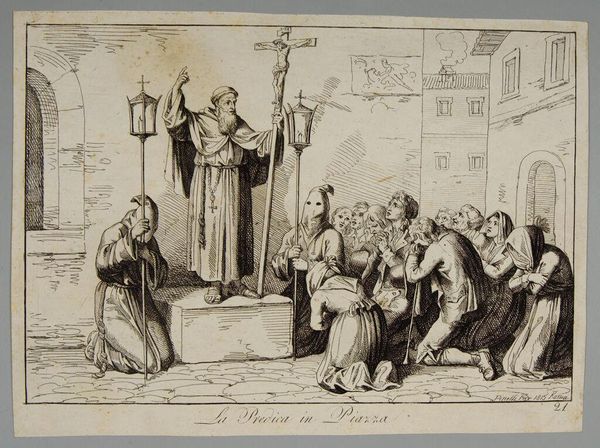 Curator: This sepia print, housed here at the Harvard Art Museums, depicts "Saint Prisca Baptized by Saint Peter" by Paul-Ponce-Antoine Robert. Editor: It has a distinctly warm and inviting atmosphere, despite depicting a rather serious religious ceremony. Curator: Indeed, the image resonates with familiar archetypes; the central figure of Saint Peter stands elevated, a conduit of divine authority. The supplicant, Saint Prisca, embodies faith and humility, a scene evoking baptism’s transformative power. Editor: I’m drawn to the printmaking itself, the way the line work creates form and texture. It makes me wonder about the engraver's labor, the tools and techniques used to render this scene for mass consumption. Curator: The image taps into an ongoing cultural narrative, a thread stretching back to the early church, constantly reinterpreted through art. Editor: Ultimately, it’s a well-crafted piece that makes you think about the material and the symbolic.
