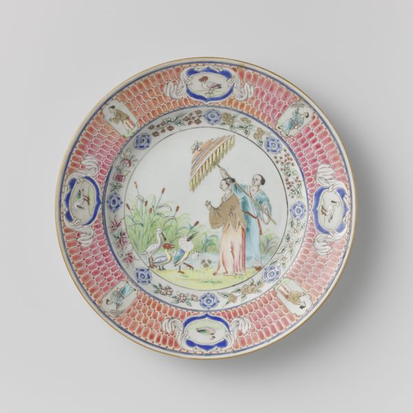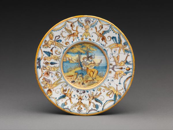 This saucer, likely made in Europe, features a mythological image based on the element fire, painted onto delicate porcelain. Porcelain itself is a fascinating material. Made from kaolin clay and fired at incredibly high temperatures, it vitrifies into a smooth, almost glass-like substance. The decoration is applied over the fired glaze, layer upon layer, each requiring separate firing. This painstaking process demanded skilled artisans, working within a highly structured workshop system. The scene depicted is fascinating, with its classical figures and allegorical elements. The painted decoration has a naïve, playful quality, a kind of misinterpretation of classical subject matter. The labor involved in the production of porcelain, from mining the clay to the final firing, often goes unnoticed when we focus solely on the image it carries. Considering the amount of work involved reminds us that even the most decorative objects are rooted in the realities of labor, trade, and the complex social dynamics of their time.