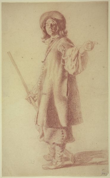 Ange-Laurent de La Live de Jully created this print titled "Nicola Zabaglia, pl. XVII from "Recueil de caricatures"", now at the Metropolitan Museum of Art, using etching techniques. The image presents a full-length caricature of a man in profile, rendered with delicate lines against a stippled background. The subject's exaggerated features and posture immediately suggest a sense of satire, inviting us to consider the artwork's critical intent. The artist uses line and form to destabilize traditional portraiture, challenging viewers to reconsider established notions of beauty and representation. The very nature of caricature relies on distorting and exaggerating features. It prompts a deeper reflection on the values and categories we impose on the human form. The subject's clothing and accessories, rendered with meticulous detail, contribute to a semiotic system of signs that invite us to interpret the individual within their cultural context. This manipulation of form is not merely aesthetic, but also a commentary on the social and philosophical norms of the time, reflecting a broader discourse on power, perception, and representation.