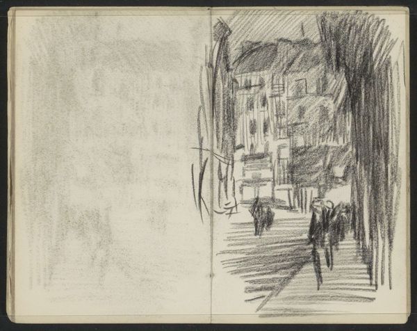 Editor: This is “Gezicht in een dorp” by Jan Veth, made sometime between 1874 and 1925. It's a drawing – looks like pencil and maybe some ink? – and it gives off this kind of quiet, almost melancholic feel. The perspective makes you feel like you’re walking right into this old town. What strikes you when you look at this piece? Curator: Oh, that melancholy, exactly! I sense that too. You know, what captivates me is how Veth manages to evoke an entire world with such a restrained hand. Look at the sketchy lines—almost trembling with intimacy—that build those buildings, those figures. It’s as if he’s not just depicting a village, but rather a fleeting memory of one. Does it remind you of anywhere you’ve ever been? Editor: A little, actually. It reminds me of a village I visited in England once, really old stone buildings. It’s the atmosphere, definitely. But, I wonder, is it just a literal depiction, or is there something more going on? Curator: Ah, that’s the question, isn't it? Veth was known for his portraits, capturing the inner lives of his subjects. I feel like he does the same here, for this village. It's a portrait of a place, a character study if you will, that evokes a mood, a feeling, rather than a precise representation. What do you think? Does it feel like a real place, or an imagined one? Editor: I guess it’s somewhere in between? It feels real because you can almost hear the sounds of the village, but also dreamlike, maybe because it’s not super detailed. Curator: Exactly. Art exists in that very liminal space – between what *is* and what *could be.* Thanks for lending your fresh pair of eyes; this piece really does invite you into its little world, doesn't it? Editor: Totally. I’m definitely seeing this drawing in a new light now. That perspective of memory makes so much sense.