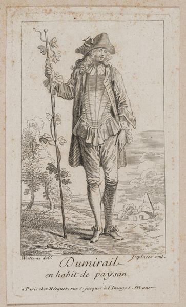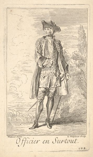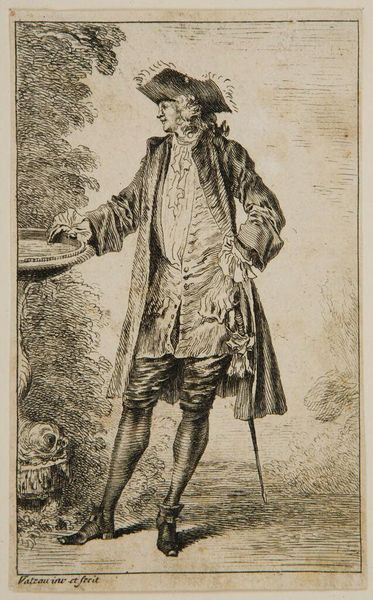 Editor: Here we have Charles Nicolas Cochin lâainé's "Strolling Man Seen from the Front", a small etching. The detail is incredible. I'm struck by how much wealth is communicated through the figure’s clothing and accoutrements. What can you tell me about this piece? Curator: Notice the etcher's line and the engraver's name, carefully placed. Consider how the print functions as both art and commodity, circulating images and ideals of the elite to a wider audience. How does this reproduction impact the understanding and consumption of social status? Editor: So, the print itself becomes a tool for distributing status? I never considered that. Curator: Precisely! The labor and materials used in production directly influence the image's social and economic impact. Editor: That’s fascinating! It really changes how I see the piece.