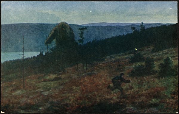 Editor: Lawren Harris's "Algoma Hill," painted around 1920 using oil paints, presents a rather stark landscape. There’s this massive, almost brooding rock form dominating the scene. What strikes you most about the imagery in this piece? Curator: The recurring symbolism of the "rock" in art is something to note; its permanence and impassivity contrast with the vibrant, fleeting nature of the autumnal foliage, a poignant reminder of mortality, wouldn't you agree? It mirrors how ancient geological features carry collective cultural memory. Do you see other juxtapositions at play? Editor: I see the stark contrast in color – the muted purples and grays of the rock against those vibrant pops of red. Is that contrast a common theme in Harris’s work, to use colour for symbolism? Curator: Yes, consider the psychological weight of color. Harris’s choice of muted tones evokes a sense of introspection, and those sudden, brief, flashes of fiery colour are more startling because of it, reflecting a hidden vitality in the landscape. A metaphor for the inner life, perhaps? Editor: That makes me see the painting in a totally different light now, not just as a landscape, but as an exploration of inner states. The rock isn't just a rock; it's…resilience? Curator: Exactly! By simplifying natural forms into bold, almost geometric shapes, Harris touches upon universal themes - endurance, transformation, the cyclical nature of time. We are looking at the very visual vocabulary that evokes profound questions about being human. How amazing is that? Editor: Absolutely amazing. It's incredible to think how much cultural and psychological depth can be embedded in what I initially just saw as a picture of a hill. Curator: Indeed, and how this image resonates differently across different viewers, reflecting their own cultural backgrounds, historical knowledge and psychological imprints, all coming together.