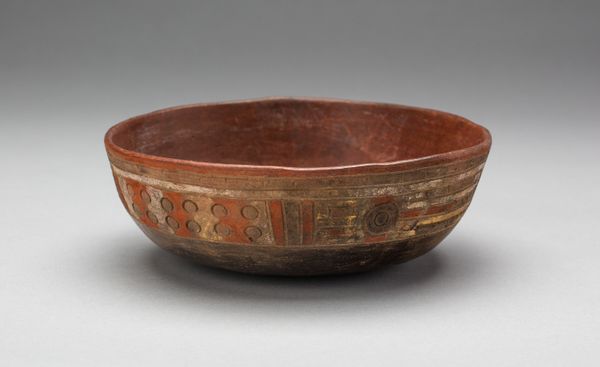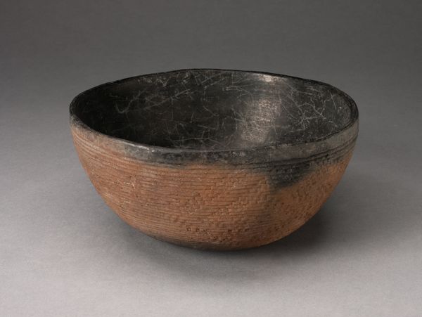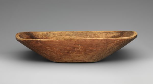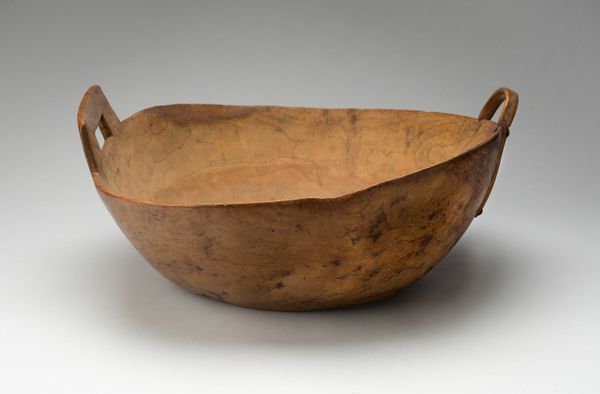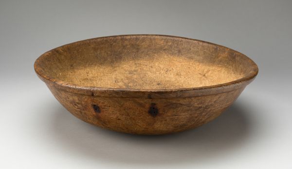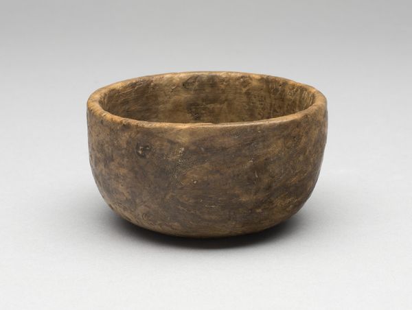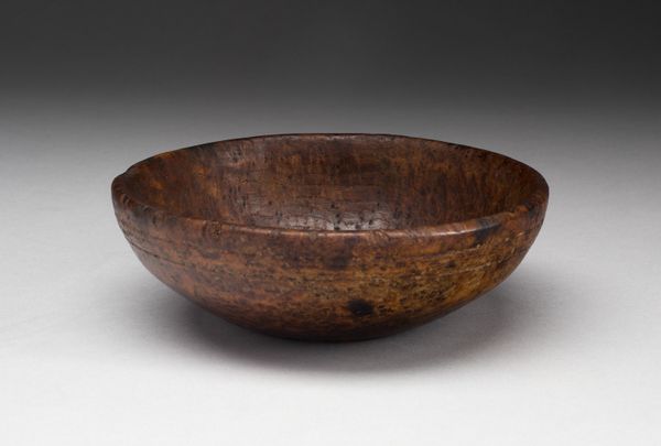 Editor: Here we have a simple yet elegant "Bowl," crafted anonymously between 1800 and 1860, currently residing at The Art Institute of Chicago. Made of wood, it strikes me as both rustic and refined in its form. What catches your eye when you examine it? Curator: The formal analysis begins with noting the simplicity of form. The bowl's curvature invites contemplation on the concept of containment and negative space. Its spherical design is expertly realised, achieving perfect symmetry when observed across its axis, further accentuating the tension between its external volume and the internal void it defines. The grainy surface speaks to the raw materiality. Do you notice the texture's implications regarding its creation? Editor: I see how the grain suggests it's carved, perhaps from a single piece of wood? Does the simplicity hide any complexity? Curator: Precisely. This reductive simplicity, paradoxically, invites deep visual inspection. How would you characterize the bowl's surface treatment and its resultant aesthetic qualities? Observe how light and shadow interplay, thus modulating the appearance of the grain structure. The patina seems deliberately maintained to evoke...what? Editor: It looks like it has been aged. The bowl feels more significant, somehow. The form is timeless and yet also clearly old and touched by use. Curator: Indeed. By studying these fundamental aspects—shape, texture, materiality, tone and light play — we grasp an entry into the core expression intended, an engagement in formal dialog between artisan, art, and audience. What do you take from this dialog? Editor: I now see how studying the raw form and textures lets the 'idea' of the bowl become timeless! Thanks for this approach. Curator: My pleasure. A clear demonstration that pure visual scrutiny offers deep aesthetic insight.