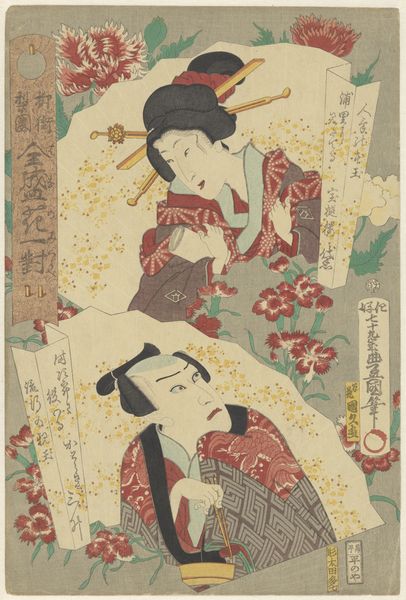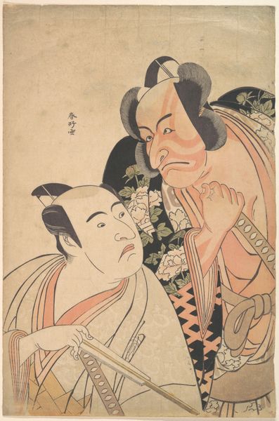 Editor: So, this woodblock print is by Utagawa Toyokuni I, made sometime between 1788 and 1808. It's a portrait of Ichikawa Komazo II, a Kabuki actor. The intricate detail of the robes, the way they’re patterned… What’s most striking to me is the flat perspective but incredibly ornate production of the textile itself. How do you see this work in terms of its materiality and the broader social context? Curator: I'm immediately drawn to the woodblock technique itself, how the material constraints shape the artistic outcome. We must consider the labor involved. These prints weren’t unique objects but products of a workshop system; many hands would contribute to the carving, inking, and printing. This materially impacts the "aura" of the piece. What does it mean for art to be produced and distributed like this at the time? Editor: It's almost like a pre-industrial form of mass production. So, does the subject matter—the actor—influence how we view the work through this lens? Curator: Absolutely! Kabuki, like woodblock prints, was a popular form of entertainment accessible to a wide audience. Think about the materials used for stage costumes versus everyday wear. The woodblock captures and recirculates that theatricality, making it available for consumption outside the theater. This reveals a great deal about the flow of capital and leisure. Editor: That connection between accessibility, performance, and material production gives me a completely different way of understanding Ukiyo-e. Curator: Exactly. Focusing on materials and production pushes us to ask different questions about value and artistic intention, broadening what we understand "art" to be at the time.