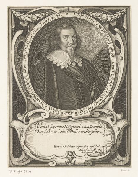 Curator: The Rijksmuseum holds a fascinating print by Elias Widemann, dating back to 1644. It's entitled "Portret van Petar Rajković." Editor: He looks so…resolute! There's a firmness to the set of his mouth and eyes. What strikes me most is how elaborately he's dressed, covered in buttons and braided toggles. What does that communicate, beyond wealth? Curator: His clothing absolutely speaks to status. Widemann depicted Rajković as a military figure, judging by his garments. In this period, portraits of military men reinforced state power and masculine ideals, contributing to the public image of authority. Editor: Absolutely. I also can’t ignore the Latin inscription around his portrait. "Non cogito de Crastino." "I do not think about tomorrow.” What kind of statement is that, memorialized around his image like that? Almost hedonistic. Curator: Yes, that's interesting because it seems contradictory in light of his obvious power and social role. It seems an odd choice to frame the leader with words suggesting an embrace of a life in the moment, detached from future concerns. Maybe this was designed to subtly reinforce the subject’s personal courage in battle? Editor: Perhaps. Or maybe to offset the visual pomp? By including the saying Widemann is grounding him. Curator: It is interesting how Widemann, as the printmaker, shapes Rajković’s public image. He isn’t simply rendering Rajković but actively interpreting him for a specific audience. Consider where prints like this circulated—how they informed societal perceptions of figures like Rajković within larger power structures. Editor: So true. The medium becomes a crucial element in this story, as the work can be distributed more broadly. We are not just examining a single portrait but its potential impact. These symbols and ideas would circulate widely, thus reinforcing prevailing social ideals, especially regarding military command and personal philosophies. Curator: Exactly. Studying art isn't solely about aesthetics, it involves understanding art as an element that both influences and reflects its historical context. Editor: And seeing how these embedded codes of symbols operate is how meaning is truly constructed and then reinforced through history.