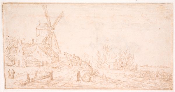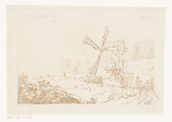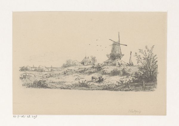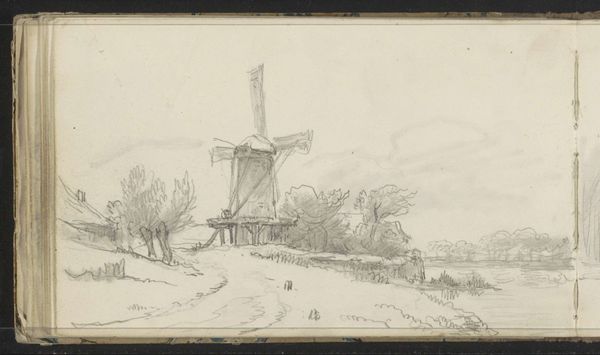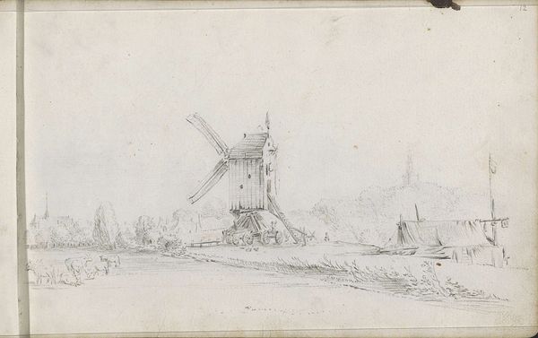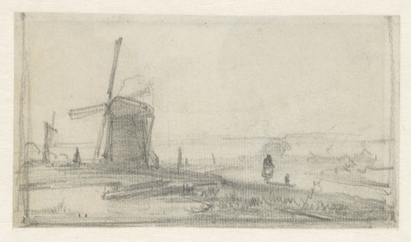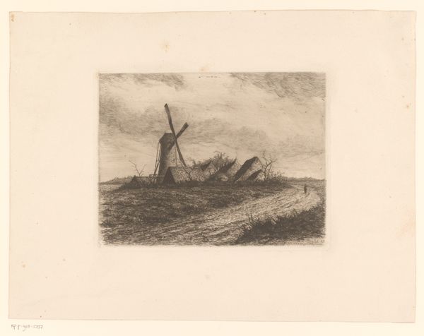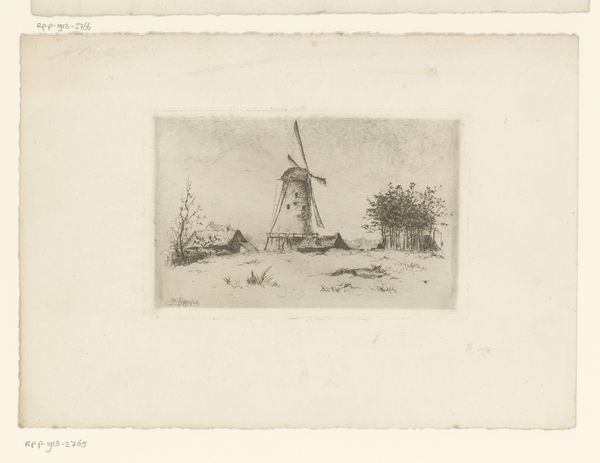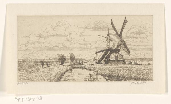 Editor: Here we have Joseph Pennell's etching, possibly from 1897, titled "Gezicht op Zaandam". The array of windmills immediately catches the eye, but the work has this dreamlike, almost ephemeral quality due to the artist's technique. What compositional elements strike you most in this piece? Curator: Observe how Pennell utilizes linear perspective to create depth. The windmills diminish in size as they recede into the distance, drawing our gaze towards the horizon line. The balance achieved through the placement of the prominent windmill on the right is notable. Notice also the delicate use of line. Editor: Yes, the linework is incredible. What’s particularly interesting to me is how much open space is included, considering there are so many windmills in the scene. Curator: Exactly. It is about form and space. Pennell uses negative space to accentuate the density of the windmill clusters, while simultaneously highlighting their isolation within the landscape. The strategic use of light and shadow is interesting. Consider the gradations of tone, particularly in the sky and the reflections in the water, that create a sense of atmosphere and volume. Editor: So, the arrangement of elements and manipulation of tone contributes to the overall effect? Curator: Precisely. Pennell constructs a scene using line, form, and tone to generate an aesthetically compelling landscape. He utilizes the graphic qualities of etching to underscore the formal dynamics. What, ultimately, does this visual language suggest to you? Editor: That’s a fascinating point, and definitely something I’ll consider next time I encounter Pennell’s work. I really appreciate this fresh formal analysis of the print's language, and how the piece communicates primarily through these elements. Curator: A worthy exploration of form over narrative; understanding it through those properties has shifted my perception too.