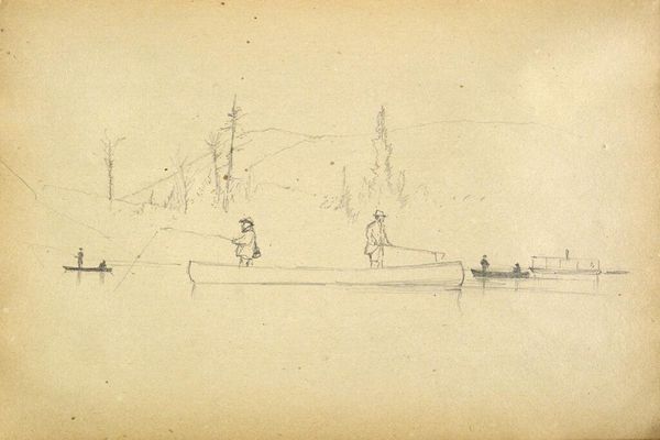 Editor: Here we have Benjamin Champney’s "Men Fishing from a Rowboat," undated, a simple pencil sketch held at the Harvard Art Museums. It feels so tranquil. What can you tell me about it? Curator: This drawing highlights the labor and leisure dichotomy. Fishing, here, isn't just a pastime, it's a means of sustenance, particularly for rural communities in Champney's time. Look at the marks of the pencil; they are not carefree, but precise. How does this materiality influence your understanding? Editor: That’s interesting. I hadn’t considered the work involved. It changes the whole mood! Thanks. Curator: Indeed. The seemingly simple sketch reveals a deeper connection to the material realities of life.