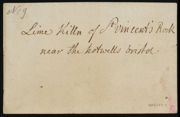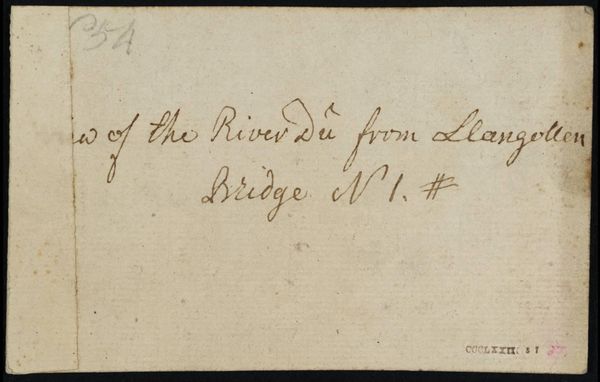 Editor: This is "[inscriptions not by Turner]" by Philip James De Loutherbourg. It's quite small, just 77 x 112 mm. It appears to be a note, in ink. What do you see in this piece? Curator: The composition is divided starkly, text above and blank space below, creating an interesting tension. The script itself, with its varying line weights and flourishes, presents a textural quality. How does that contrast inform your understanding? Editor: I hadn't thought about it like that, but I see the contrast now. It seems almost like the text is floating above a void. Thanks for your perspective.