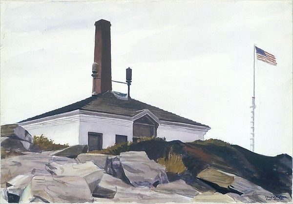 This small chromolithograph of Boon Island, part of a series to promote Honest Long Cut Tobacco, presents a stark coastal scene dominated by a lighthouse. The composition is striking, with the lighthouse rising vertically against the low, horizontal lines of the buildings and rocky shore. The interplay of color and form is particularly notable. The red hue of the lighthouse creates a visual anchor, drawing the eye upwards and suggesting a sense of warning. The geometric simplicity of the lighthouse contrasts with the irregular, natural forms of the landscape. This tension between the man-made and the natural world is reinforced by the flattening of perspective, typical of printmaking, which emphasizes the surface and design over depth. The text at the bottom, almost like a caption, anchors the image to its practical function as a signal—"Fixed White. Bell struck in answer to Signals"—reminding us that even within commercial art, there's an interplay between aesthetics and function.