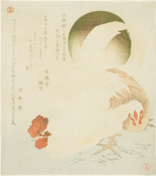 Curator: This small print, residing here at the Harvard Art Museums, is titled "Orchids, with poem by Ichijian Kigyoku," attributed to Kubo Shunman who lived between 1757 and 1820. Editor: It feels like a breath, doesn't it? A quiet moment captured. The soft colors, the way the lines are so deliberately placed—it's meditative. Curator: Indeed. Note how Shunman employs the subtle gradations of color to define form, a key element within the ukiyo-e tradition. The poem is integral; it’s not merely decorative. Editor: Right, the script itself becomes part of the composition, like another delicate stem reaching up. It makes me wonder what the poem says. Curator: The text is a collaborative addition, offering commentary, perhaps adding layers of symbolism that enriches our reading of the floral motif. Editor: It's a conversation, really. Between the artist, the poet, and, now, us. I feel grounded, but also uplifted. Curator: I agree. A remarkable piece. It makes one consider the delicate interplay of image and text, line and form. Editor: It makes me want to write poetry.