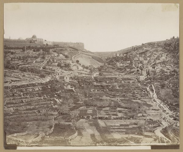 Editor: This gelatin silver print from Giorgio Sommer, created between 1857 and 1914, captures the ruins of an amphitheater in Syracuse, Sicily. It’s haunting, in a way, to see such an ancient place standing, but also so clearly crumbling. What strikes you when you look at this image? Curator: What I find compelling is how photography itself becomes a tool in shaping our perception of the past. Sommer isn’t just documenting the ruins; he's participating in the nineteenth-century project of defining and preserving cultural heritage. Consider who is viewing this photograph, and what kind of understanding they take away of ancient Sicilian culture through this photographic representation. Editor: So you are saying this image isn't really objective, it's been shaped by cultural expectations and...the tourist industry? Curator: Precisely! Images like these catered to a growing interest in archaeological sites. Sommer’s photograph makes the site appear romantic, almost picturesque, inviting viewers to see Syracuse through a specific lens – one of melancholic beauty and the grandeur of a bygone era. Look at the figures within the scene; they are dwarfed by the architecture, enhancing the monumentality. Editor: That makes a lot of sense. It almost feels like I'm seeing what someone *wanted* me to see, not the full story. Like a postcard! Curator: Yes! And, consider the institutions which then collect and display such imagery and think about how certain viewpoints get elevated and valorized through these museum systems. It compels us to think critically about the power dynamics inherent in visual representations of history. Editor: It definitely gives me a new appreciation for considering the social and historical context of what I am viewing! Thank you. Curator: And for questioning whose stories are being told and preserved, and how!