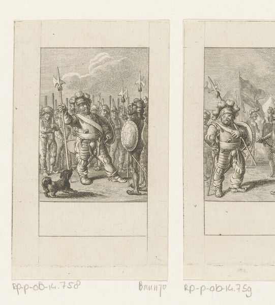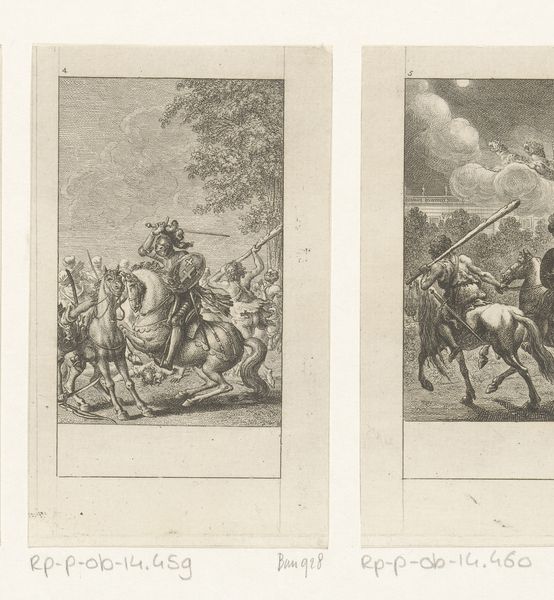 Curator: This is "Gustaf III van Zweden op zijn paard," made around 1790 by Daniel Nikolaus Chodowiecki. It’s an etching and engraving, currently held in the Rijksmuseum. The intricate lines forming the scene are really quite striking. It makes me wonder about the artist's skill in conveying detail. Editor: Yes, it's a beautiful example of the print medium! The clear lines create almost a graphic quality that separates it from traditional painting. What do you find particularly interesting about its visual composition? Curator: Notice how Chodowiecki uses line weight and density to create depth. Look at the contrast between the light tones on the King's horse and the darker, densely etched areas in the background. Do you think this helps to draw our eye toward the figure of Gustaf? Editor: Absolutely! The horse and rider stand out. And the figures behind him, those observing, they’re rendered with a captivating minimalism – just enough to suggest a crowd. It almost has a stage-like quality. Curator: Precisely. Also, observe the linear patterns created by the buildings and the posture of the King and his mount, as it gives a clear and defined feeling within a compressed space. This control of line gives it dynamism within the structure. How might you compare these features to other examples of 18th-century portraiture? Editor: Well, there’s a simplicity here, in the line work, that stands apart from the often-ornate style of the time. And how these qualities highlight what feels distinctly 'modern' about the work, the focus on stark linear design? Curator: Indeed. These are elements that elevate it beyond simple documentation, inviting close visual study and repeated encounters. Editor: I agree. It really sheds light on how much can be expressed through lines and composition!