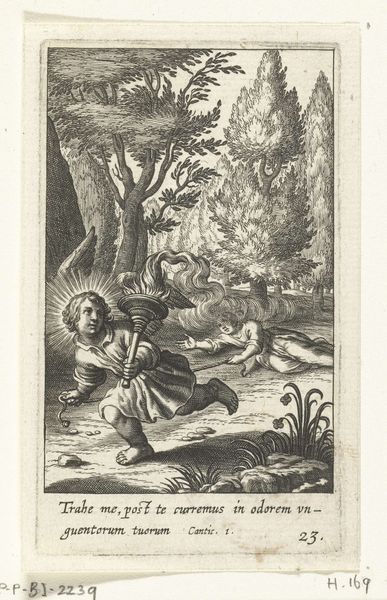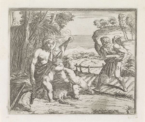 Orazio Borgianni made this print, depicting God appearing to Moses in the burning bush, sometime around the early 17th century. It is made with etching, a printmaking process that relies on the corrosive action of acid. The artist would have started with a metal plate, coating it with a waxy, acid-resistant ground. Using a needle, he would have drawn the composition, exposing the metal underneath. When the plate was submerged in acid, the drawn lines would be bitten, creating grooves. The longer the plate was exposed, the deeper the lines. To make the print, ink was applied to the plate, filling the etched lines, and then the surface was wiped clean. Finally, paper was pressed against the plate, transferring the ink and creating the image we see here. The fine, precise quality of the etching technique emphasizes the drama of the scene. The controlled lines add to the sense of awe and the divine presence. It's a reminder that even in the age of mechanical reproduction, the artist's hand and technical skill were crucial in conveying spiritual themes and cultural narratives.