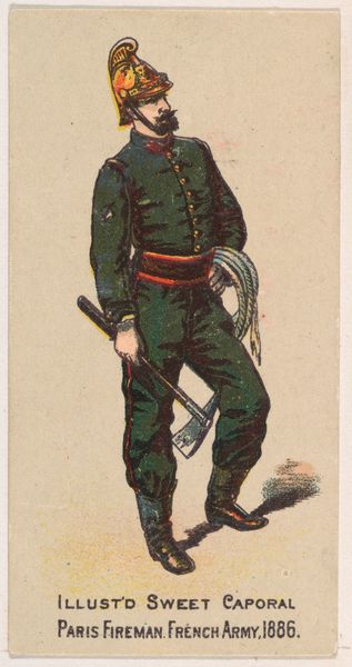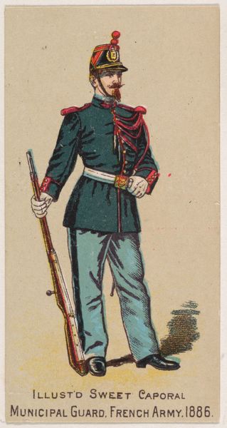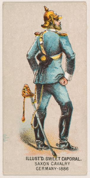 This small chromolithograph was produced by the Kinney Brothers Tobacco Company in 1886, as part of a series of military figures used to promote Sweet Caporal Cigarettes. But what does this image of a German infantryman tell us about the social and political landscape of the late 19th century? Germany, newly unified after the Franco-Prussian War, was flexing its military muscle. This card, with its detailed depiction of the soldier's uniform and weaponry, reflects a broader cultural fascination with military power and national identity. The inclusion of the smoking pipe is interesting: it reveals the normalisation of smoking in that period. Cigarettes and military service become intertwined with ideals of masculinity. To fully understand the image, we need to consider its original context. Advertising trade cards like these were designed to be collected and traded, circulating images of national pride and military strength to a wide audience. By researching Kinney Brother's business practices and marketing strategies, along with period sources, we can get a better idea of the complex relationship between commerce, culture, and the construction of national identity in this era.