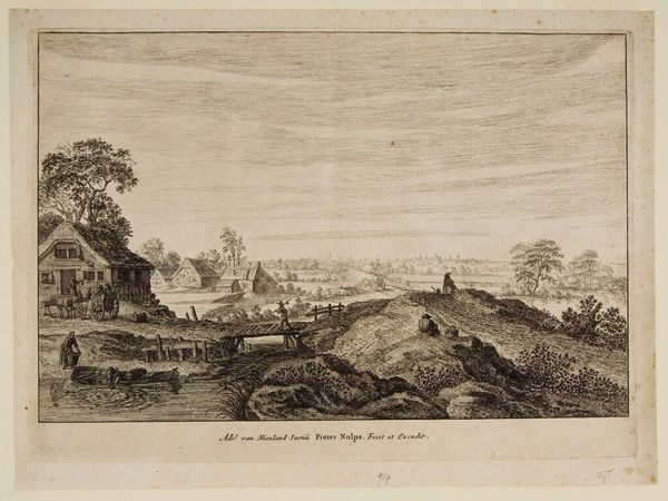Curator: This is "Landscape with a man driving sheep," an engraving by Pierre Étienne Moitte. I'm immediately drawn to the detail achieved through the engraving process. Editor: It's a rather serene scene. The sky is heavy, yet the figures on the road seem undisturbed by the approaching storm. I wonder, though, about the social implications. Curator: Indeed, engravings like this were often commissioned, reproduced, and consumed widely. The labor involved in creating the plate would have been significant. Editor: And who benefits from this labor? Is it reflecting a pastoral ideal for a privileged class, removed from the actual hardships of rural life? The figures seem less a part of the landscape, more like additions for its aesthetic effect. Curator: Well, consider that the print medium allowed for wider access to landscape imagery, influencing ideas about nature and property. Editor: True. And thinking about property is crucial because it shapes our relationship with the environment. Curator: Ultimately, Moitte's engraving becomes a record of both artistic skill and the society in which it was produced. Editor: A poignant reminder to consider the context and human element behind even the most seemingly tranquil scenes.