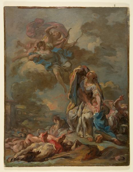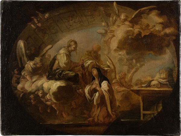 Pietro Antonio Magatti created this oil on canvas painting titled ‘The Appearance of a Female Martyr’ in the 18th century. The painting depicts a dramatic scene of martyrdom, typical of the religious art commissioned by the Catholic Church in Italy. Looking at the art market and institutional settings of the time, you would see that the piece reflects the Church's promotion of its power through emotional and awe-inspiring imagery. The martyr ascending to heaven contrasts the violence on Earth. The Baroque style, with its dynamic composition and emotional intensity, served the Church's agenda of inspiring faith and allegiance. To understand the painting better, you could delve into the Counter-Reformation's artistic strategies and the specific saint whose martyrdom is depicted, exploring the visual and textual sources Magatti might have drawn upon. Art history emphasizes that artworks like this are not just aesthetic objects but cultural documents, shaped by historical forces and actively participating in them.