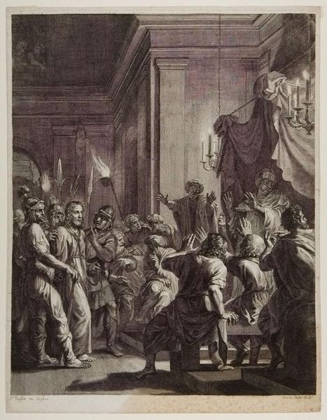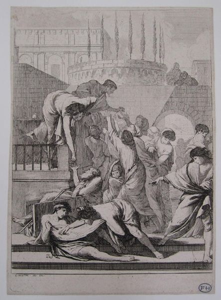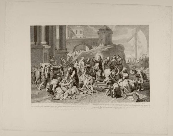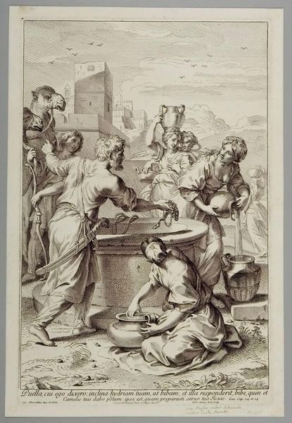 Curator: This is an anonymous work entitled "Banquet in front of a Castle," currently residing at the Harvard Art Museums. Editor: It's striking! There's a real dreamlike quality to the gray washes and the way the figures are arranged feels almost theatrical. Curator: The grandeur of the setting is intriguing, given the social history of such feasts. Consider the power dynamics inherent in displaying abundance while others might lack basic necessities. Editor: Precisely. Who are these people, and what narratives are being excluded or silenced in this celebratory depiction? Also, notice the angel of death in the sky. Curator: Good observation. This memento mori serves as a grim reminder of mortality amidst opulence. Editor: A potent reminder that such displays of power are always transient. I leave this image with a renewed sense of art's capacity to both celebrate and challenge social structures. Curator: Indeed. Let us remember that the banquet is fleeting, but the questions it raises linger.