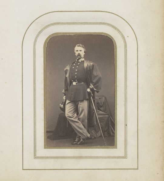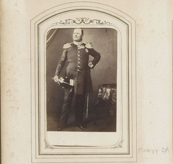 This is a portrait of Willem III, King of the Netherlands, made by Robert Severin. The photograph's formal composition immediately strikes us with its rigid verticality, mirroring the upright posture of the King. The monochromatic palette flattens depth, focusing attention on the details of his uniform. The array of buttons, tassels, and medals creates a semiotic field, each element a signifier of power and status. The image's structure seems designed to reinforce established hierarchies. Yet, the very act of representing power through reproducible media introduces a rupture. The photograph, unlike a painting, democratizes the image of the King. Consider how the photograph, as a medium, challenges traditional notions of aura and authenticity, prompting a reconsideration of representation itself.