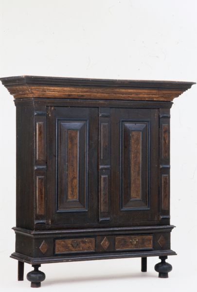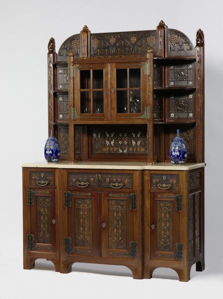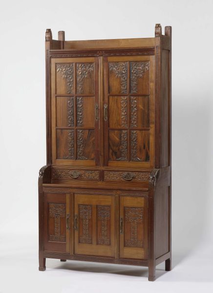 Curator: Here we have a striking example of Art Nouveau craftsmanship: the “Buffetkast van coromandelhout, deels belijmd met amboinawortel,” or Coromandel Wood Sideboard, partly decorated with Amboina Root. It's dated circa 1900 to 1930 and is part of the Rijksmuseum’s collection, attributed to Carel Adolph Lion Cachet. Editor: Wow. It feels like stepping back in time. A time capsule, almost, holding onto secrets from the turn of the century. It has a wonderful warm feeling to it. I love how those various woods swirl together. Curator: The use of coromandel wood, along with the amboina root, exemplifies Art Nouveau's penchant for exotic materials and natural forms. Note the deliberate geometric structuring combined with organic, flowing lines in the carvings. The structure juxtaposes squares, rectangles, and that bold semi-circular arch at its crown. Editor: Those carvings! The delicate woodwork that supports the upper display sections is enchanting. But the upper section gives me a heavy feeling...almost like the spirits trapped behind the glass. Curator: While emotional interpretation has its place, consider the artist’s formal intentions. Cachet likely employed these motifs to evoke a sense of luxury and refinement, reflecting the decorative principles of the movement. Also, the central glazed display section functions as a focal point. Editor: True, it's gorgeous. The warm color palette does create that sense of luxury and... intimacy, too. But maybe the way it towers over us enhances the feeling of holding hidden secrets. Curator: Consider how this sideboard exemplifies Art Nouveau principles—integration of nature, embracing modernity with handcrafted details, and overall symmetry in design. All that aside, I confess to sensing a bit of whimsy about it. Editor: Exactly! Seeing that sense of warmth that surrounds this particular period. Almost feels as if you should place it inside a room while the smell of baked bread wafts through the space.