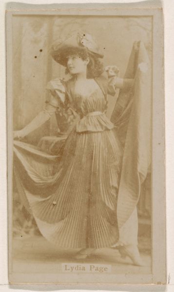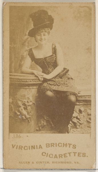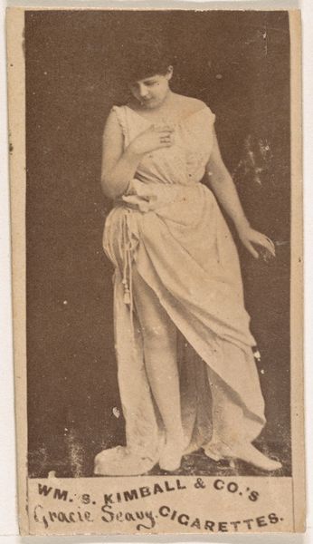Editor: This is “Mlle. Cafferl” from the Actors and Actresses series by Allen & Ginter, dating from around 1885 to 1891. It's a small print combining etching and photography. It's very striking how this piece aims to depict this woman. What can you tell me about its cultural context? Curator: The "Actors and Actresses" series is so revealing about the late 19th century's commodification of fame. Here, Mlle. Cafferl is transformed into a collectible object, a fetishized image. What does it mean to take an actress, a performer whose power resides in their presence, and reduce them to a card distributed with cigarettes? Consider the male gaze inherent in this process. How might this objectification have impacted Mlle. Cafferl's agency, her ability to control her own image and narrative? Editor: I see what you mean. The print format really turns a person into a disposable image. It is also an interesting example of advertising using famous actresses, like influencers. It looks so…fragile and fleeting. How were women perceived during that time and did being a famous actress have advantages? Curator: The late 19th century witnessed a struggle for women's rights, but also deeply entrenched societal expectations. Actresses, while admired, occupied an ambivalent space, often viewed as transgressive figures. To be visible as an actress, Mlle. Cafferl had to embrace her perceived identity, a potential battle against the male-dominated status quo. Editor: So this card is not just an image, it is an interpretation. I wonder if she approved. Curator: Precisely! By analyzing such objects, we uncover complex narratives about power, gender, and representation that still resonate today. Thank you for offering insight to the project with an open mind and inquisitive curiosity! Editor: Thanks to you. I hadn't considered that this little card contains such complex layers of social commentary.