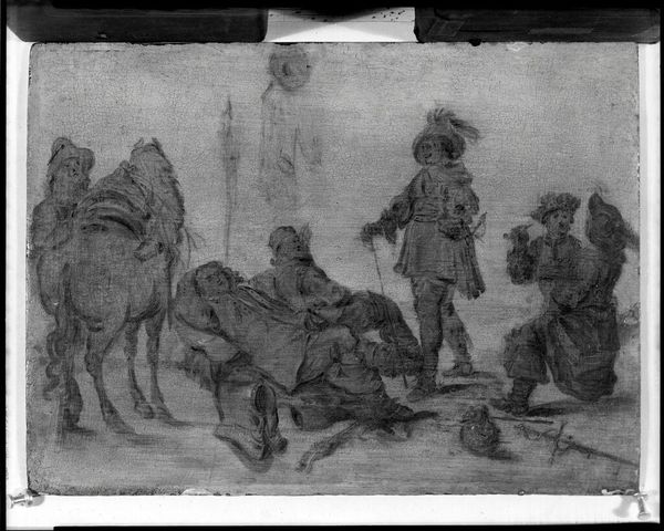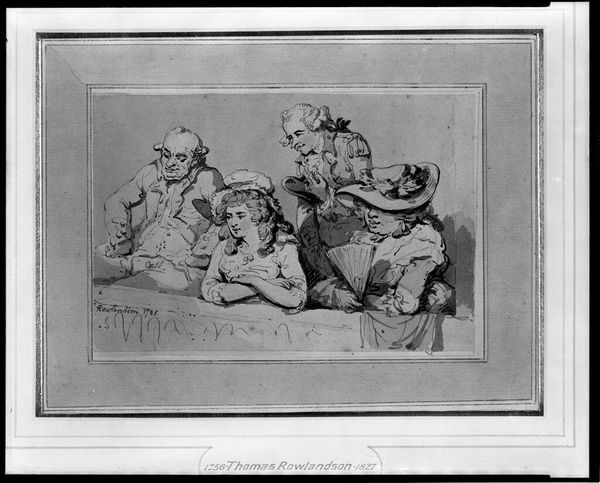 Curator: Look at this, Thomas Rowlandson's "Tavern Bar," housed right here at the Harvard Art Museums. The etching captures a lively scene, doesn't it? Editor: Indeed. The composition is rather dynamic, almost chaotic. The eye bounces between the various figures, never quite settling. What is the social context here? Curator: Taverns were hubs of social life in Rowlandson’s time. This piece really communicates the role of gathering spaces and class. It's an etching, a process allowing for multiples, making it more accessible to a broader audience. Editor: The artist’s marks and lines create a mood of unease and dissipation. It draws the viewer in using its composition and scale. The figures are rendered with caricature-like features, exaggerating their expressions and postures. Curator: Rowlandson’s work often critiqued social mores. The labor involved in producing such an image is also worth noting. Editor: Agreed, and visually, the organization and flow across the space tell a story of social interplay and commentary. Curator: Exactly. It gives us a glimpse into the 18th-century social fabric. Editor: A fascinating study of form and culture.