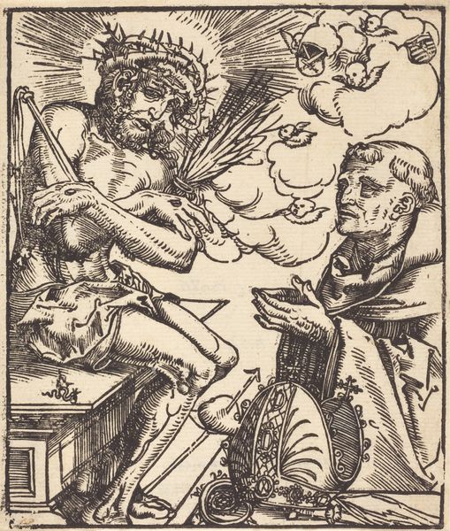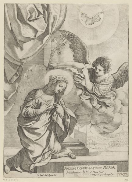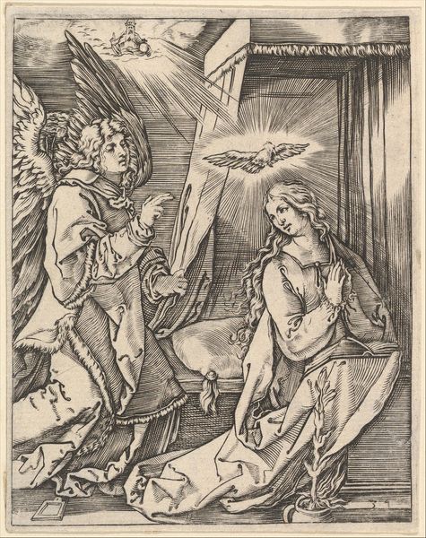 Francesco Denanto created this image of the Annunciation sometime in the late 16th century, using a woodcut technique. Woodcut is a relief printing process. The artist carves an image into the surface of a block of wood, leaving the printing parts level with the surface while removing the non-printing parts. Consider the amount of work involved in the production process of this artwork. The artist needed mastery of the tools and a deep understanding of the material. Woodcut is often associated with folk art and printmaking, and it allowed for the relatively inexpensive reproduction of images. In this piece we can see the textures and form achieved in the angel's wings, and the rich landscape viewed through the window in the background, adding a sense of depth and perspective. Understanding the materials, and the making process allows us to appreciate the skill and the historical and cultural context in which the artwork was created. It encourages us to see the broader implications of art production in society.