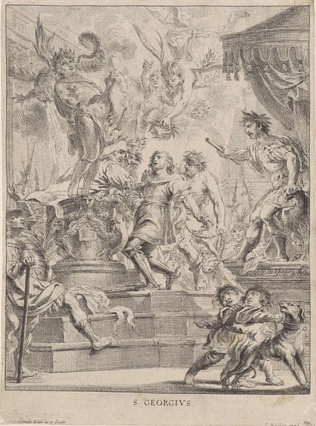 Editor: This is "La Gloria" by Cornelis Cort. It's an engraving showing what looks like a heavenly ascension, maybe? The figures below are so dynamic, reaching upwards. What do you see in this piece? Curator: For me, it's a dance of light and shadow, almost a visual hymn. Look at the contrast—the earthly striving below mirroring the divine serenity above. Do you feel how Cort's lines create a sense of upward movement, like a whispered prayer taking flight? Editor: I do see that now, a story in lines. It's less static than I first thought. Curator: Exactly! It’s not just an image; it's an invitation to imagine, to feel the pull between our world and something…more. Editor: I hadn't considered that tension before. It’s something to keep in mind.