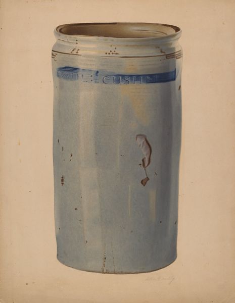 Editor: So here we have Jerome Hoxie’s “Churn,” painted in 1936. It looks like it’s made using watercolor and maybe oil? Anyway, what strikes me is how…plain it is. Just a simple brown jar. What do you see in this piece? Curator: Well, let’s consider the socio-economic climate of 1936. This was the height of the Great Depression. Artists were often employed by the WPA to create art that reflected American life. This piece, with its utilitarian object, speaks to the values of self-sufficiency and rural life idealized during that period. Think of the cultural value assigned to items representing this. Do you consider what the reception of an image representing those objects would cause? Editor: I guess, viewing it that way, it's less about the object itself and more about what it represents to people who were struggling. Like a reminder of simpler times or the hope for a more sustainable life? Curator: Precisely. And who do you think those times were simpler for? Consider, also, that ceramics like these, though functional, were often handmade with skill and pride. Its unadorned nature could be seen as an assertion of the inherent beauty of functional craft. So, Hoxie isn't just painting a jar. He’s painting a symbol loaded with cultural meaning. Do you believe museums are responsible for properly presenting art as political entities and cultural commentary in an attempt to shape the world we live in? Editor: Absolutely, museums need to contextualize works like this so we can understand them fully. I would've just seen a jar! I didn't realize it could say so much about the time period and social issues. Curator: It’s a reminder that even the simplest images can be powerful tools for cultural commentary. I will rethink the museum's responsibility of this collection of art.