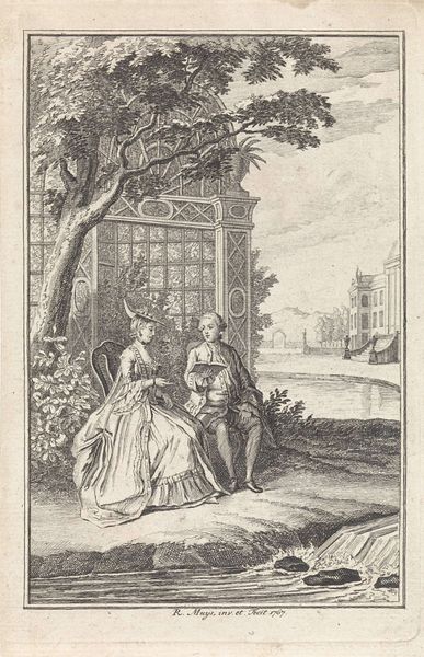 Curator: What strikes me most about this print is the rigidity of the characters compared to the sensuous curves of the formal garden they occupy. Editor: Yes, it's an interesting juxtaposition. The artist, Jan Punt, created this engraving titled, "Man en zijn maîtresses in een tuin" or "Man and his Mistresses in a Garden," in 1758. Look how the hard lines of the building sharply contrast with the sprawling foliage. Curator: It’s all very performative, isn't it? The gentleman, seated and clearly preening under the attention of the women, reminds me of theatrical staging. It is, after all, a scene designed for public consumption, even within its intimate setting. The print undoubtedly speaks to the socio-political norms around courtship, class, and performance of power during that era. The entire scene appears almost like a tableau vivant intended to express status and cultivated taste. Editor: Absolutely, and consider the use of line to define form here. The crispness in the rendering of fabric, foliage, and architectural details underscores the rococo love of elaborate surface detail. The overall organization, though seemingly casual, reveals careful attention to asymmetry. See the delicate web of lines creating soft shadows. Curator: Shadowing in the Rococo period was carefully calculated for mood enhancement and visual intrigue, which absolutely ties in with the broader aristocratic culture in the 18th century—a society invested in outward appearances, fashion, and the construction of the self for an audience. Editor: The details of their garments, the posture, the architectural background… It all speaks volumes, indeed. There's an almost hyper-awareness of style and mannerism, heightened through precise linear detailing. Curator: Indeed, an engraving such as this offered a readily accessible means of circulating such idealized images. In many ways it reinforced the hierarchies of the day by showcasing particular lifestyles while subtly promoting societal aspiration. The print then not merely documents, but actively shapes cultural preferences. Editor: Agreed, the distribution of images like these allows viewers to study the fine balance between line, space, and texture… Perhaps its lasting impact is rooted in the intersection of form and context, offering insights into the way social performance influences aesthetic preferences. Curator: Exactly, for me, this is an image dense with cultural messaging made more accessible through its form and broader circulation in 18th century Dutch society.