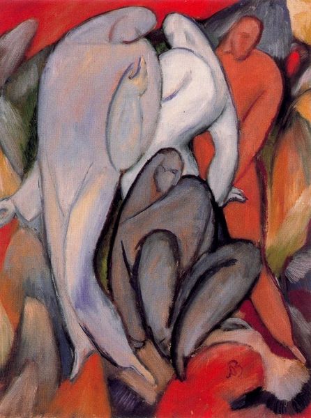 August Macke’s painting "Indianer" presents us with figures amidst a vibrant, almost dreamlike, natural setting, invoking the romanticism and exoticism characteristic of its time. Consider the way the figures emerge from the lush vegetation, their faces marked with a solemn expression. This evokes the noble savage trope, a concept deeply rooted in the European imagination. It parallels the classical motif of the "genius loci," the spirit of a place, here transposed onto the indigenous figure. We see echoes of this in Renaissance depictions of satyrs and nymphs, guardians of the forest, their countenances reflecting the wildness and untamed nature of their domains. Note how the heavy-lidded eyes and subdued demeanor subtly convey a sense of melancholy. This hints at a psychological depth, inviting us to consider the weight of cultural encounter and the complex emotions tied to the colonial narrative. This symbol has resurfaced, evolved, and taken on new meanings in different historical contexts.