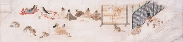Ogawa Haritsu created 'Procession of Frogs' in the 18th century, using ink and color on paper. Haritsu, also known as Kenzan II, lived during the Edo period, a time of economic growth, strict social order, and flourishing arts in Japan. This whimsical scene deviates from the traditional representations of nature. Instead of idealized landscapes or symbolic flora, Haritsu presents us with an almost satirical parade of frogs, some of which appear to be dressed in human clothes, and engaged in various activities. It suggests a playful inversion of social hierarchies. The careful composition and skillful brushwork, however, reveal Haritsu's deep understanding of artistic conventions. Consider the perspective through which Haritsu views the world. His choice to animate frogs in this way invites us to reflect on our own place within the broader ecosystem, and to reconsider our understanding of the world. It is also a moment of shared experience with the artist, as we, like him, observe the world with curiosity, questioning the established norms. Ultimately, the 'Procession of Frogs' is not just a lighthearted depiction of animals; it’s a reflection on society, seen through the eyes of an artist who dared to challenge conventions.