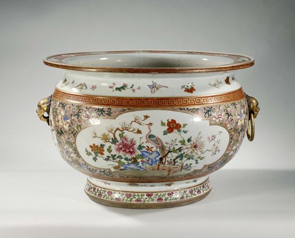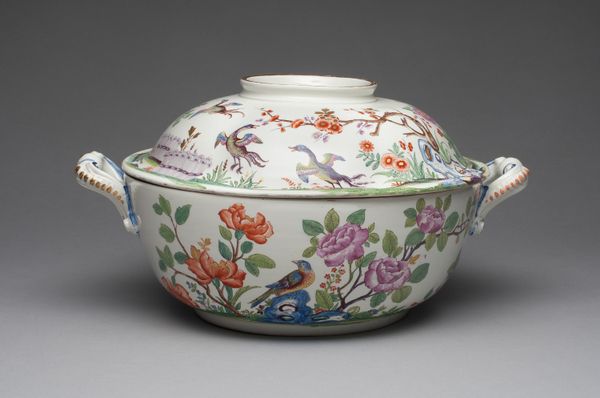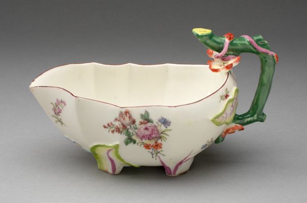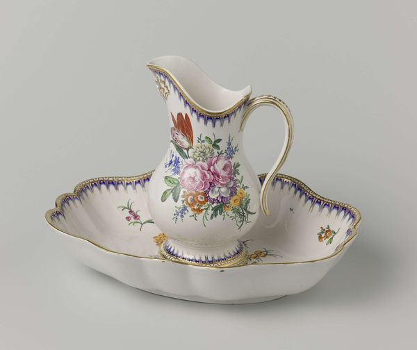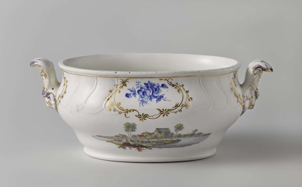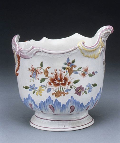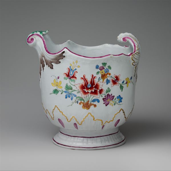 Curator: This is a porcelain Wineglass Cooler crafted in 1758 by the Manufacture nationale de Sèvres, now held at the Art Institute of Chicago. Editor: It's dainty! The Rococo ornamentation gives it such an elegant and delicate appearance. The scalloped edge and floral garlands practically sing of carefree indulgence. Curator: Indeed, Sèvres was at the forefront of luxury porcelain production, closely tied to the French court and aristocratic taste. Pieces like this would have signified refinement and status. Can you see how its placement at court served as propaganda? Editor: I do. The composition is deceptively simple. The garlands form a perfect symmetry around the bowl, even with the variations in the flower arrangements, which, themselves, follow natural asymmetrical patterns. And look how that thin blue and gold lining defines the shape against its whiteness. Curator: Absolutely. These seemingly frivolous objects served a very specific function, reinforcing social hierarchies and displays of wealth. What's more, the very creation of Sèvres itself served as an emblem of French national pride, rivaling porcelain production in England. Editor: I understand it politically. Still, let's not forget that they were, indeed, artisans who produced objects like this wineglass cooler. The hand-painted details bring a human scale to it. Curator: I suppose it's also worth mentioning the changing roles of museums themselves in these perceptions, and what is even presented to the public... Editor: No matter the forces at play, there is no denying its beauty in detail! Curator: Well, I see why one might still take joy from its decoration despite all that. Editor: So we've moved through structure and historical and social forces...a beautiful confluence of form and function.