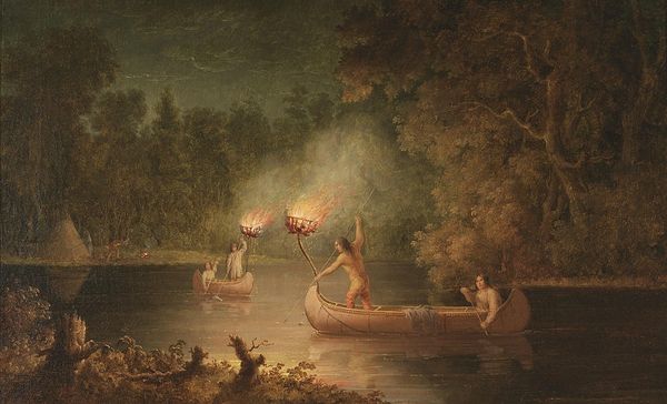 Curator: Look at the figures, casually arranged in a boat on a serene body of water. We are observing "A Party Angling" by George Morland. Editor: It strikes me as quite staged, almost like a tableau vivant. The contrast between the fashionable attire and the rustic setting is particularly intriguing. Curator: Indeed, the figures’ clothing contrasts sharply with the outdoor setting, underscoring the complex social dynamics at play. Consider how this image situates wealthy leisure activities in relationship to labour and power. There's the question of who is included in the 'party,' and who is perhaps serving it. Editor: I can’t help but wonder about the symbols. The act of fishing, often loaded with religious significance relating to abundance, or spiritual wealth. Does the reflection of the figures in the water carry a metaphorical message of self-reflection or perhaps a distorted sense of reality, a focus on wealth while those supporting are excluded? Curator: A keen observation. While the figures enjoy their leisure, are they oblivious to the labor that makes this scene possible? Their apparent disconnect reminds me of current conversations about wealth, privilege, and environmental exploitation. This resonates when we interpret through today's framework regarding the effects of our socio economic class upon ecological responsibility. Editor: Also, how water usually is seen, which in art functions as the subconsciousness: so a party engaging, dipping, is revealing here perhaps more unconscious behaviours? They’re penetrating and disturbing the still surface... Curator: Absolutely, and to expand upon your insightful commentary on the distortion of the surface tension and reality; notice too that the lack of strong perspective gives it a feeling of an altered space. Editor: This gives a kind of disquieting, surrealistic feel to the otherwise tranquil image. Makes one think further beyond that placid party scene and that world. I shall never look at leisurely angling the same way again, truly. Curator: Well, considering the themes it invites us to investigate—the ethics of wealth and labour and what is actually below a tranquil, and wealthy facade, it makes me appreciate the many complex meanings the painting has.